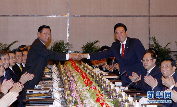 6月29日上午9时,两岸两会领导人第五次会谈在重庆举行,海协会会长陈云林和海基会董事长江丙坤在会谈中将就签署两岸经济合作框架协议及两会后续商谈议题等交换意见。这是陈云林(右)和江丙坤(左)在会谈前握手。新华社记者陈建力摄
