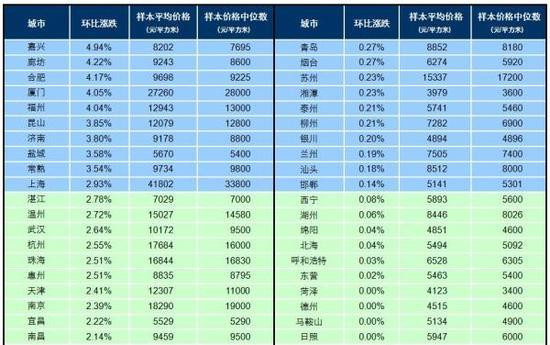 具体来看,嘉兴、廊坊、合肥、厦门、福州涨幅相对较高,在4%-5%之间;昆山、济南、盐城、常熟、上海涨幅在2.93%-4.00%之间。