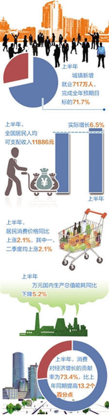 二是居民收入稳定增长。上半年,全国居民人均可支配收入11886元,同比增长8.7%,扣除价格因素,实际增长6.5%。从人均水平看,居民人均收入增速稍快于人均GDP增速,居民收入增长与经济增长基本同步。扣除约0.5%左右的人口自然增长因素,上半年人均GDP增速约为6.2%,低于全国居民人均可支配收入实际增速0.3个百分点。从城乡协调看,农村居民收入增长继续快于城镇居民。上半年,农村居民人均可支配收入同比实际增长6.7%,高于城镇居民0.9个百分点。