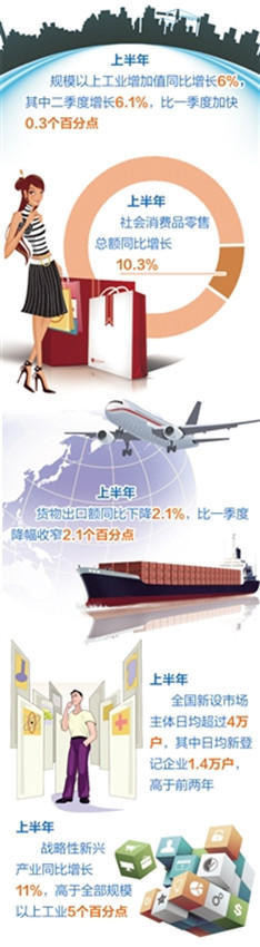 上半年,我国经济保持了总体平稳、稳中有进、稳中有好的发展态势。国内生产总值同比增长6.7%,这一中高速增长伴随着就业增加、收入提高、生态改善、结构优化、效益回升,既有工业企稳、服务业较快增长的有力支撑,又有消费稳定增长、出口降幅收窄拉动的作用,还有新经济加快成长、新旧动能有序转换的贡献。