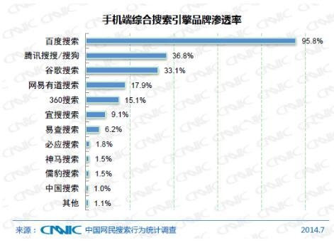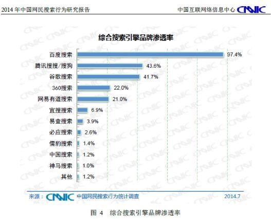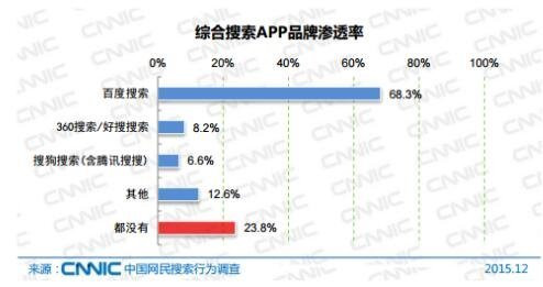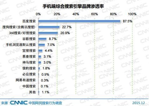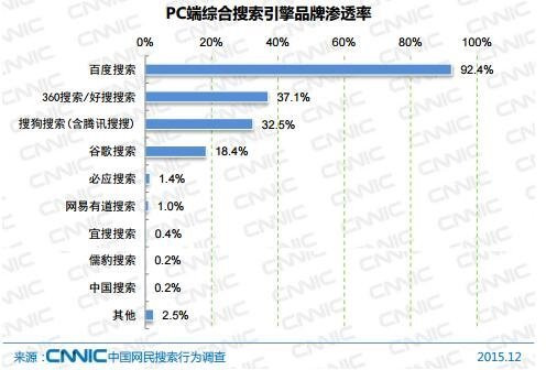 2016年7月,中国互联网络信息中心(CNNIC)发布《2015年中国网民搜索行为调查报告》。报告显示,截至2015年12月,我国搜索引擎用户规模达5.66亿,使用率为82.3%,用户规模增长率为8.4%。搜索引擎已经成为中国网民的基础互联网应用,使用率仅次于即时通信。其中,360搜索品牌渗透率达到37%,仅次于百度搜索,稳居全平台第二。