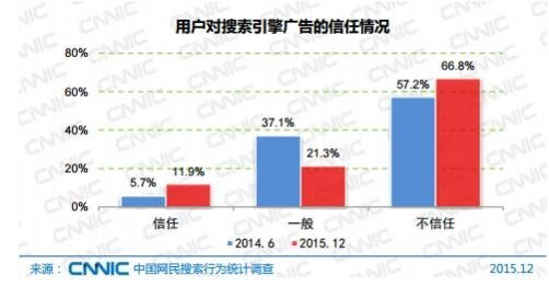 值得一提的是,CNNIC报告显示,2015年用户对搜索引擎广告不信任程度大幅上升,高达66.8%。根据CNNIC第37次《中国互联网络发展状况统计报告》,2015年在网上遇到消费欺诈的网民比例达16.4%,较2014年提升了3.8个百分点,互联网消费欺诈事件频发。