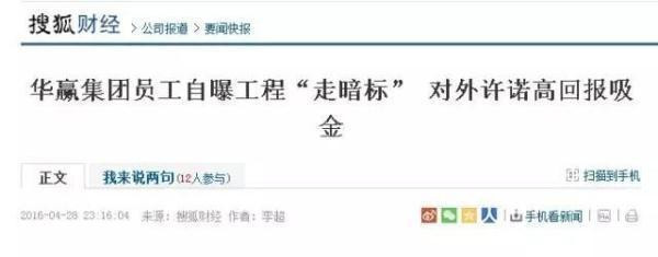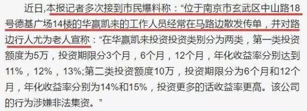 为什么说华赢凯来问题不断?就拿这两年的报道来说吧,比如在2015年11月的一篇报道中,《北京商报》的记者就曝出这家公司许诺给投资者过高的年收益回报,从10%-13%不等,可该公司投资的项目基本上都是一家来自“中国建设企业联合集团有限公司”的企业。 而更神奇的是,这家企业的老总与华赢凯来老总,还是同一个人!--这也就是说,一旦该公司发生跑路事件,那么从法律方面来看的话,该公司的理财项目一般都会被界定为“非法吸收公众存款”!