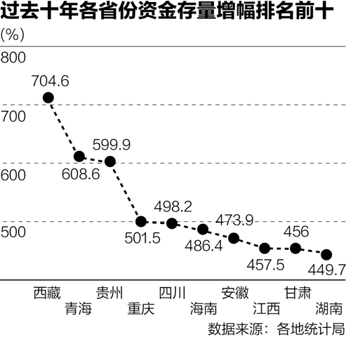 从增速来看,过去10年来,资金存量增速超过400%的省份共有14个,超过450%的省份有9个,主要集中在中西部地区,其中西藏、青海和贵州高居前三。