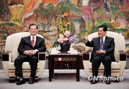 4月29日,中共中央总书记胡锦涛在上海会见了前来出席世博会开幕式的连战、吴伯雄、宋楚瑜等台湾各界人士。 中新社发 廖攀 摄
