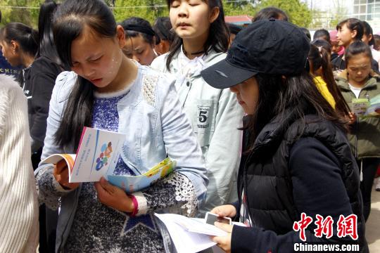 图为项目官员为当地少数民族少女发放宣传册。 钟欣 摄