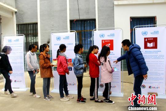 图为项目官员为当地少数民族少女讲解。 钟欣 摄