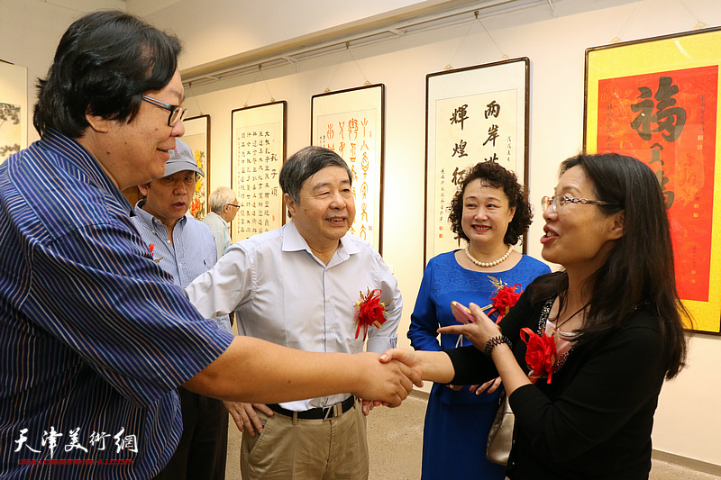 马丽娣、毓峋、孟昭良在展览现场交谈。(图片来源:天津美术网)
