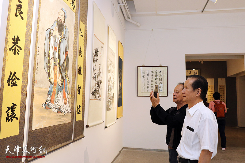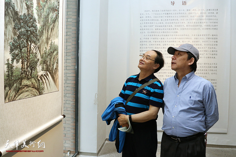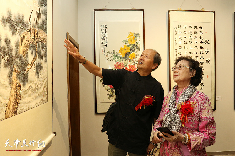 崔炳顺、徐铁志在展览现场观看作品。(图片来源:天津美术网)