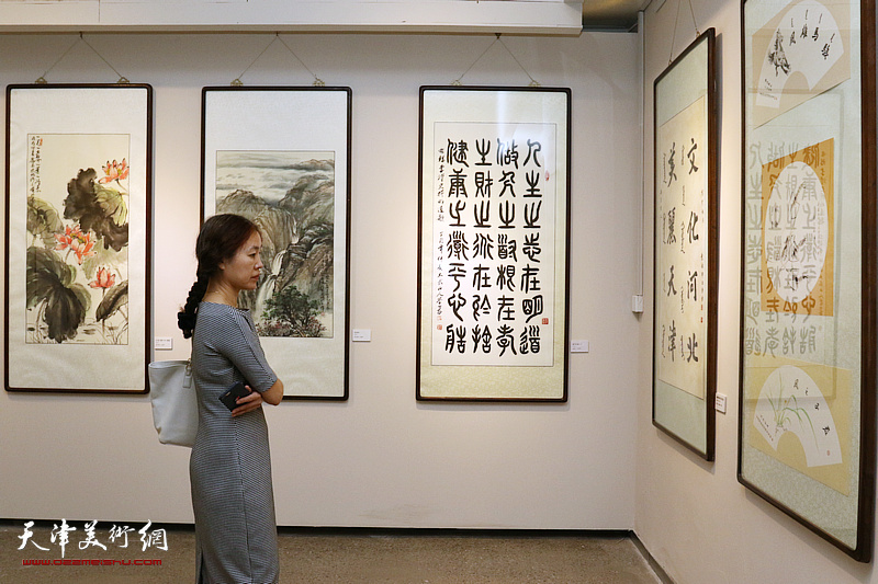 文嘉在展览现场观看作品。(图片来源:天津美术网)