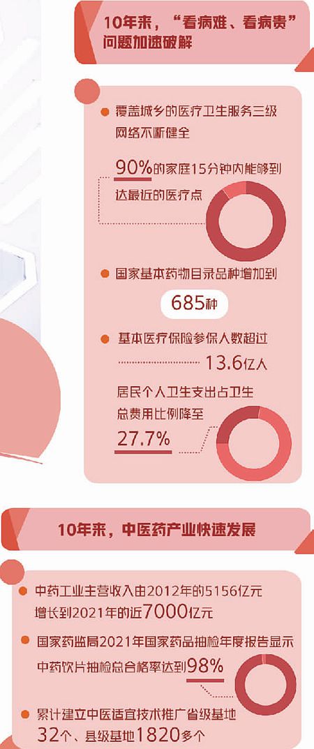 党的十八大以来,党中央、国务院坚持把人民健康放在优先发展的战略位置,我国走出了一条中国特色卫生健康事业改革发展之路。其中,中医药产业守正创新、传承发展,服务更公平、更可及、更便利,呈现出良好的发展态势。