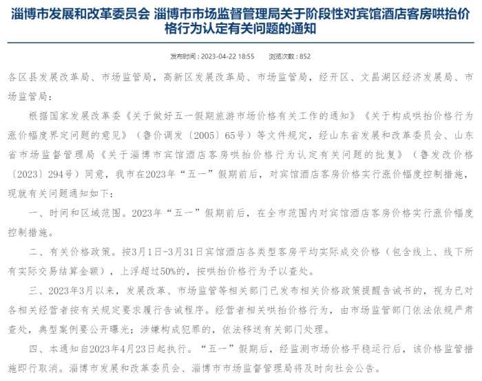 例如,淄博市近日发布的通知明确,在2023年“五一”假期前后,对宾馆酒店客房价格实行涨价幅度控制措施。按3月1日-3月31日宾馆酒店各类型客房平均实际成交价格(包含线上、线下所有实际交易结算金额),上浮超过50%的,按哄抬价格行为予以查处。