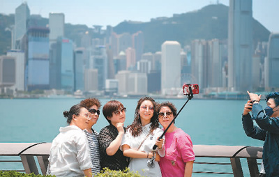 游客在香港星光大道自拍合影。