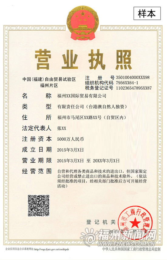福州新闻网3月9日讯 福建自贸试验区福州片区相关建设正如火如荼开展。记者昨日从市市场监管局获悉,自贸区企业工商执照版式已经敲定,实行“一照三号”登记制度,上面载有企业注册号、组织机构代码证号和税务登记证号三个号码,申请人持该照即能够替代现有的三证对外开展经营活动。此外,自贸区营业执照注册号前、“住所”具体地址后依次加注“中国(福建)自由贸易试验区福州片区”“自贸区内”字样(如图)。