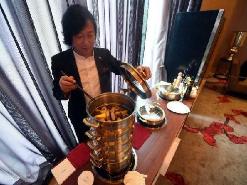 图说:由中国饭店协会2011年授予“中国十大名厨”称号的钟利文,近年来潜心研究新型烹饪方法,于今年春天推出了无油、无水的新型烹饪用具——生鲜焖锅。据介绍,生鲜焖锅是用钛合金材料制作,具有聚热快、烹饪时间短、营养不流失等特点,热源采用电磁设备,没有烹饪污染。“生鲜焖锅”于2015年7月获得了国家专利。 新华社发