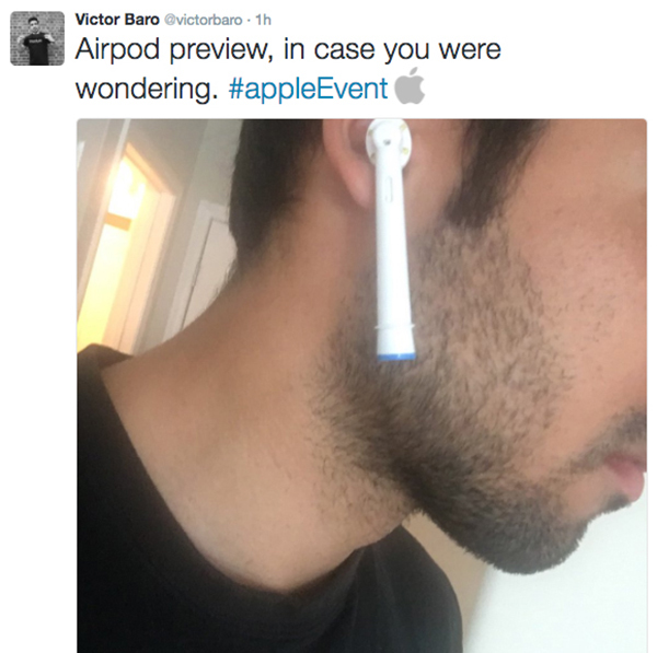 接着,认证信息是IOS开发工程师维克多·巴罗@ victorbaro也发了一张图片,把电动牙刷头塞进耳朵里,称这就是带着AirPods的样子。(不得不说,还真挺像的。)