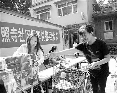 龙潭街道11个社区都设置了旧自行车兑换点,居民可用废旧自行车兑换卫生纸等生活用品。经济日报记者 崔国强摄