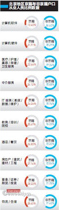 《中国经济周刊》与智联招聘联合发布的统计数据显示,在20个行业中,只有银行业的京籍人口就业率高于非京籍人口,达到59.83%。其余行业均是非京籍人员的就业率更高,而差距最为悬殊的5个行业中,京籍人员的就业率均不到25%,其中就包括计算机软件、硬件以及IT服务3个技术类行业。