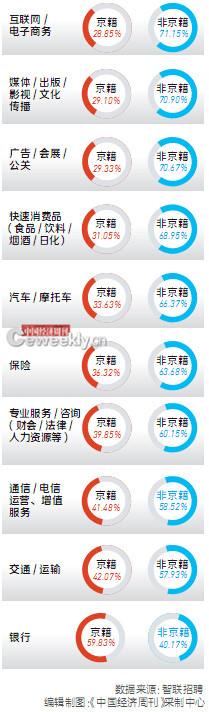 对此,智联招聘首席人力资源顾问郝健向《中国经济周刊》记者表示,从数据来看,北京的白领群体中,非京籍白领比例在大多数行业中占比都超过半数。其中,一些新兴产业,如IT服务、电子商务等,非京籍白领占七成左右。这是由于这类行业专业门槛较高,本地人力资源无法满足行业的快速发展,会有很多非本地人员补充进来,再加上中国互联网产业布局以北京为中心,吸引了众多人才流入。