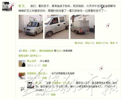 5月21日,记者看到有网友于17日,在QQ空间发布一侧消息称,“看好孩子,真有偷孩子的车,我实拍的”,要求网友转发,写有详细拍摄地为“河北省邯郸市峰峰矿区义井镇李庄村”,附有照片清晰显示拍摄地、驾驶人、车辆及车牌号等。次日,该网友回复评论中称“这个是个团伙”,在附近两个村庄也看到类似可疑车辆。这一消息迅速被网友转发,截止21日上午12时,在QQ空间已被转发1389次,近千名网友点赞。