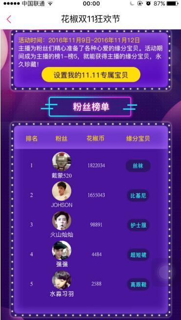 “双十一”当天各大电商激战正酣,直播平台也加入“双十一”战局。花椒直播主打全场礼物五折,并推出“主播宝贝 淘淘淘”的营销活动,用户可以根据自己的打赏排名获得主播自己设定的礼物。