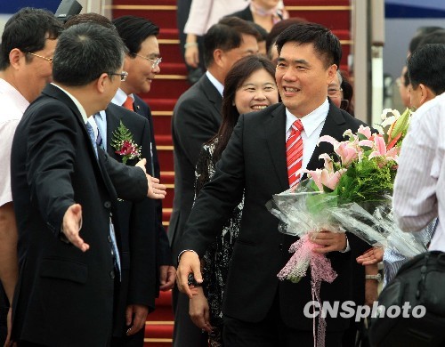 6月14日,台北市长郝龙斌搭乘台北松山—上海虹桥首航飞机抵达上海,并表示,90分钟的直航是历史性的。 中新社发 潘索菲 摄