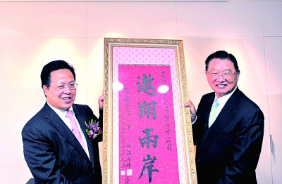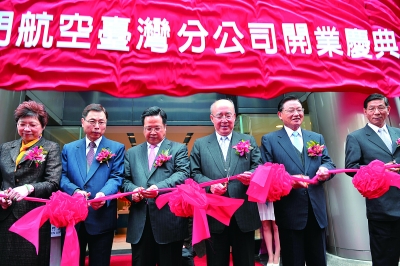 中国国民党荣誉主席吴伯雄(右三)、海基会董事长江丙坤(右二)等与厦航总经理车尚轮(左三)共同出席厦航台湾分公司剪彩仪式。