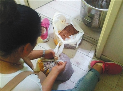 7月10日,北京像素“吉太太灌汤蒸饺”,老板娘将刚碎好的肉馅装进塑料袋。