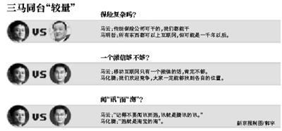 虽然是合作伙伴,马云(左二)在现场向马明哲(左一)和马化腾(左三)频频发起挑战。