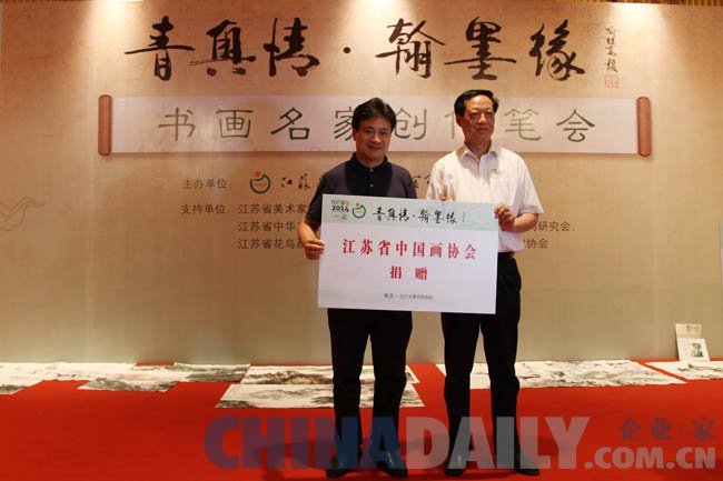 中国日报网讯 8月8日,为了庆祝南京青奥会即将召开,弘扬奥林匹克精神,传播中国优秀传统文化,江苏省中国画学会响应并配合江苏省发展体育基金会在南京举办了“迎青奥.翰墨缘-书画名家创作笔会暨捐赠活动”,著名画家喻继高、赵文元、盖茂森、徐培晨、毕宝祥、张广才、张兴来、赵治平、韩显红、翟优、顾宪、高建胜、徐建明、张玉宝、王野翔、孙元亮、贾俊春、朱小元、刘守瑶、樊蕾等捐赠了作品。