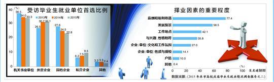 “公务员热”继续降温。调查中,虽有33.3%的受访毕业生择业首选政府机关或行政事业单位,但比2013年、2014年分别下降了3.2个、0.7个百分点。外企则继续受到沪上毕业生的青睐,今年选择外企就业的比重达到32.1%,与选择机关事业单位比重几乎持平,比2013年、2014年分别上升5.6个、1.4个百分点。高校毕业生虽对私营企业依旧缺乏热情,但较2013年、2014年比重分别上升3.3个、2个百分点。自身发展前景、用工权益保障和收入稳定性,仍是阻碍毕业生走进私营企业的三大顾虑。(记者 徐蒙)