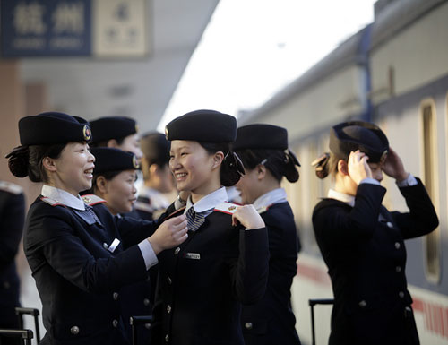 12月20日,杭州列车段T31次列车的乘务员换上了新式服装。据了解,T31是杭州唯一一趟进京的特快列车。在春运到来前,他们投资260多万元,改善列车人性化设施,更新乘务员着装,培训职工业务技能,在铁路运输线上树立标杆、塑造形象。(图片来源:国新图库)